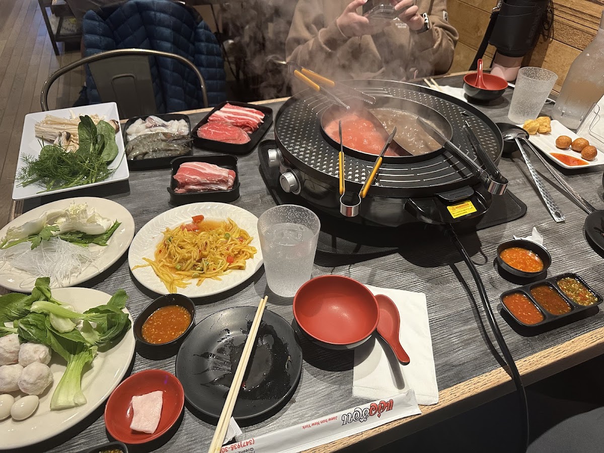 The best hot pot place in NYC, and probably my favorite of all the hot pot places ever. The only Thai hot pot place that I know of in the city as well. It is AYCE and the prices have gone up over the past few years from $19.95 until now $34.95. Thank you, inflation. But it is still worth it. And it is CASH ONLY, which is slightly inconvenient, but still worth it. The broth is always so delicious. I always stick with the Tom Yum and Jaew Hon broth. They are both spicy and flavorful. Some days are more spicy than others. The beef is good quality and fresh. I especially like the fish filet and calamari. To dip these in their amazing spicy lime sauce - just divine. Since Covid, the customers are no longer allowed up to the veggies and rice stand. But the servers are quick with getting me what I need. I love the morning glory which none of the other hot pot places has. It is perfect when soaked in the flavors of the Thai broth. Another unique item is the unlimited garlic rice! My husband always devours this. Even though the place is small and the menu items are not expansive like some major hot pot restaurants nowadays, the freshness of the ingredients, the flavorful broth choices, the delicious sauces are more than enough to keep me and plenty of other from coming back. I always enjoy my meals here. It was worth the trek to Queens every single time.