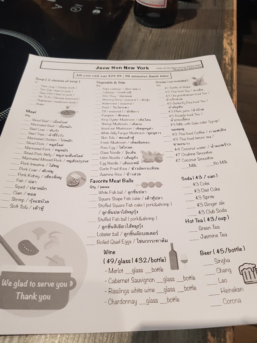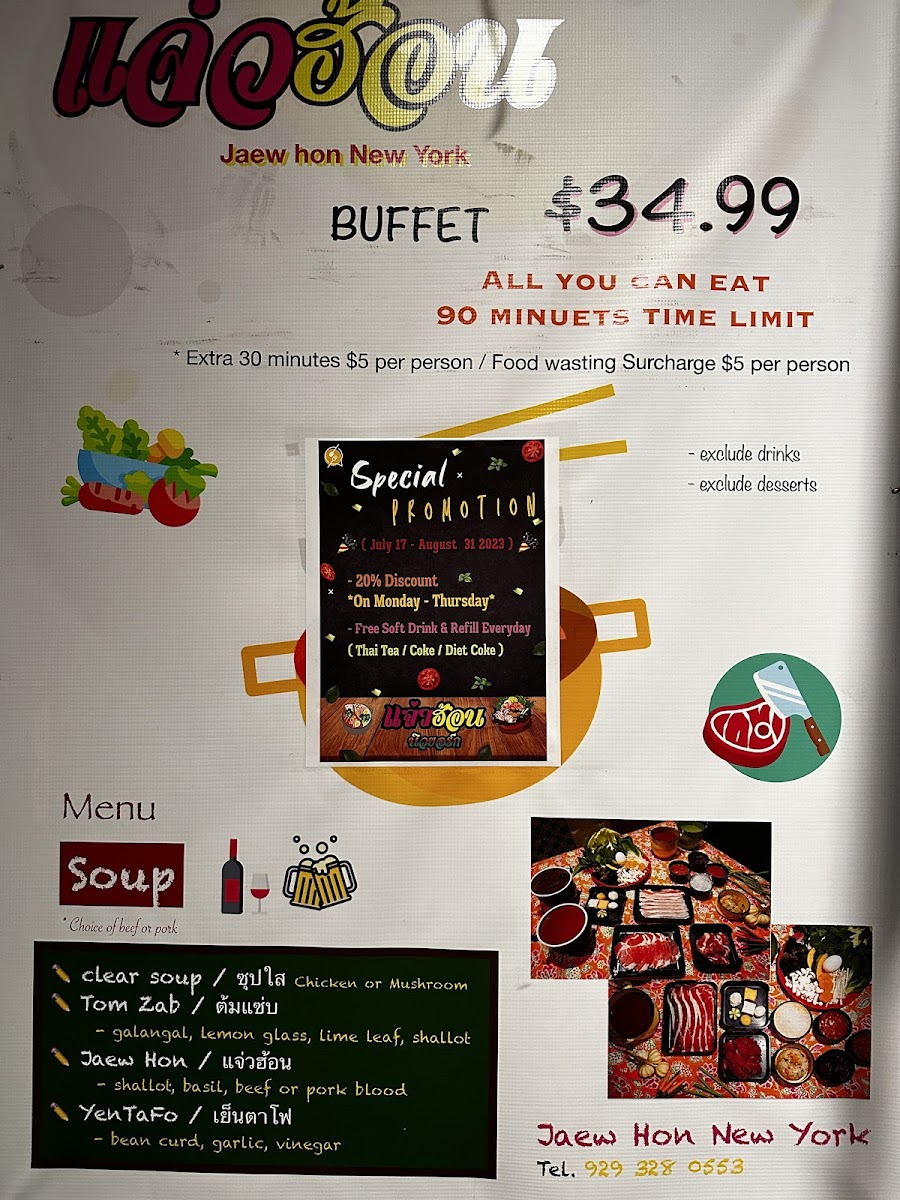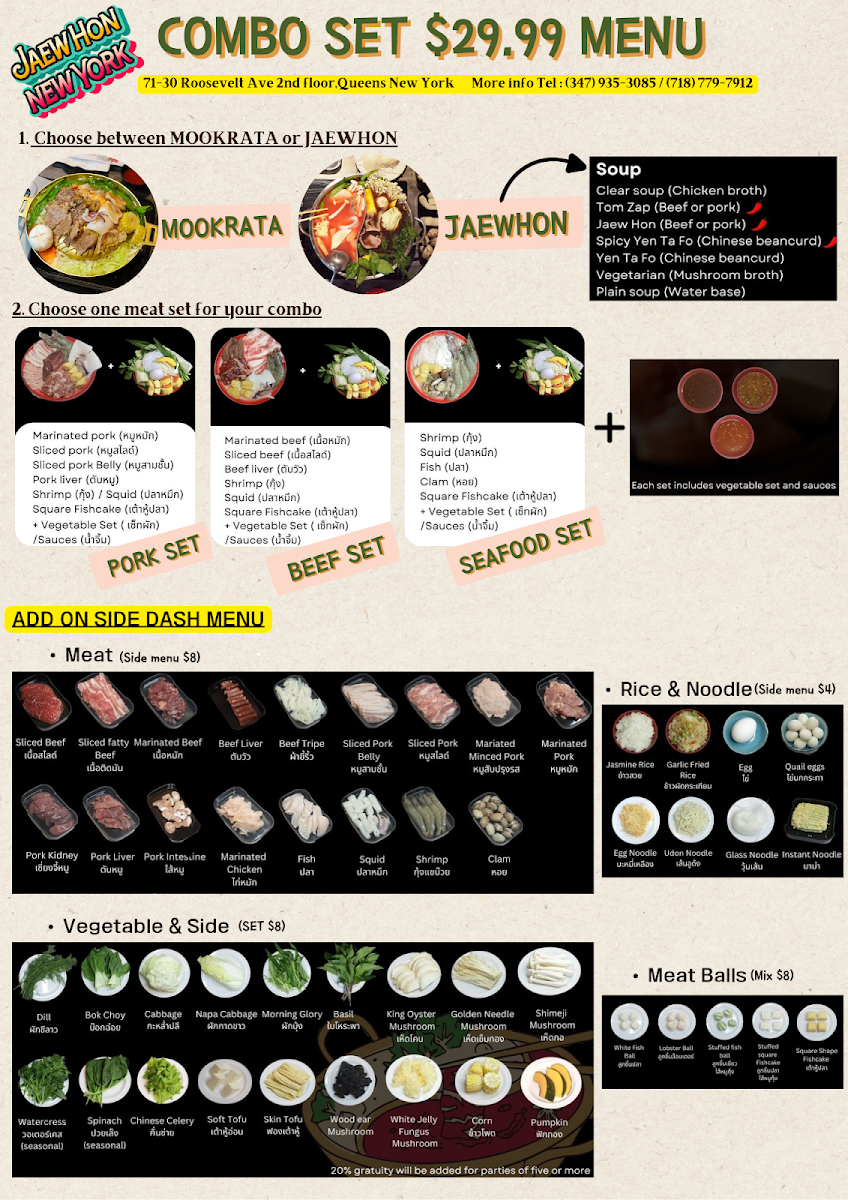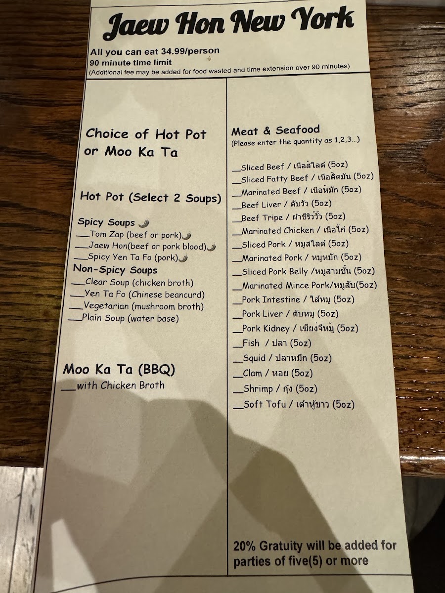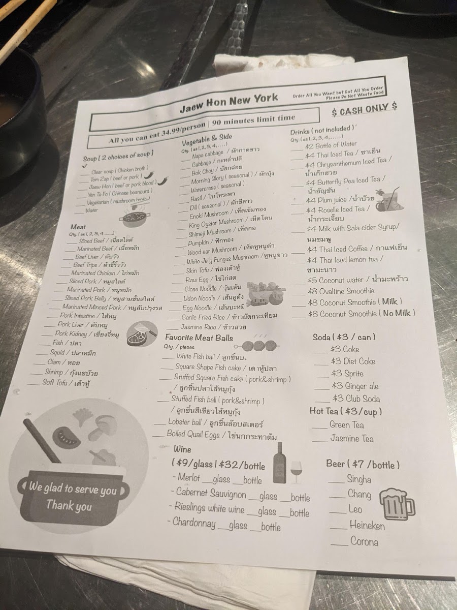 The menu at Jaew Hon offers a comfortably casual dining experience centered around authentic Thai hot pot and a selection of flavorful dishes and drinks. It’s well-suited for sharing with friends or family, whether you’re settling in for a relaxed dinner or enjoying a lively gathering. The food focuses on fresh ingredients and balanced flavors, with highlights like Thai hot pot served alongside rich, savory broths and a variety of dipping sauces that invite personalized tastes.
